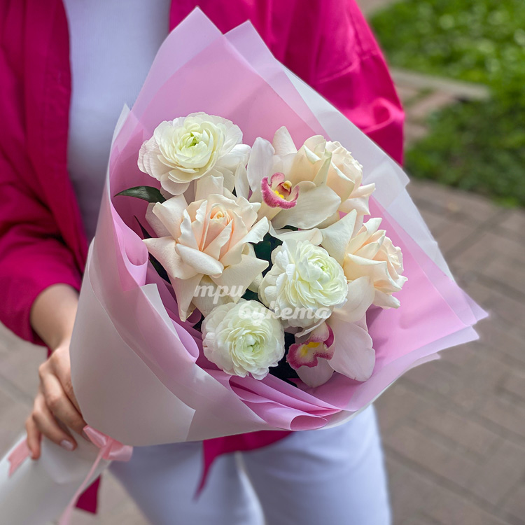 Белые ранункулюсы и орхидеи с розами